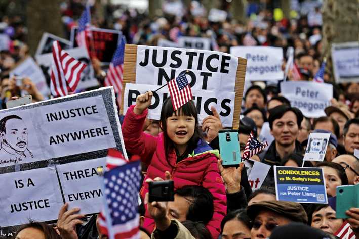 出于义愤和同情,全美40个城市的华人在2月20日出动,声援梁彼得,仅在纽约现场就有上万人的规模,他们举着“No Scapegoat” (不当替罪羊)、“ Justice for Peter Liang”(公正对待梁彼得)的标语。许多不识英文的新老侨民都到达了抗议现场。细聊之后,会发现他们很多人对于案情细节不了解,有的连梁彼得被判的罪行都说不清楚,但他们认为梁无心开枪杀人,却要面临15年牢狱之灾实在太惨。他们举着标语高喊新学到的英文口号,忿忿表达对梁的白人搭档逃脱制裁、非裔检察官为了政治前途挑华裔警察这个“软柿子”捏的不满。