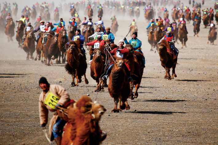 蒙古国南戈壁省达兰扎德盖德市举行的骆驼节,骆驼骑手参加15公里的越野竞速比赛。共有1115峰骆驼参加该项比赛,创造了新的吉尼斯世界纪录。骆驼曾在蒙古民族的生活中发挥过特殊作用,因此被草原牧民尊为“牲畜之王”。