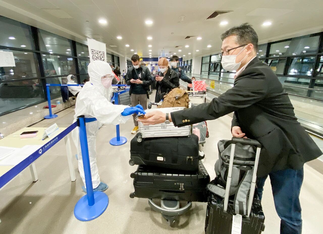 3月19日,上海浦东国际机场,工作人员核实入境人员信息 ?图 / 新华社